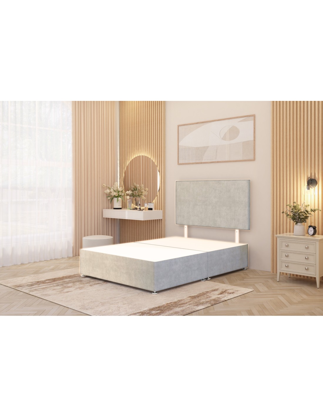 This divan set comes with a memory foam mattress and headboard. The base has no drawers. Upholstered 32" headboard can be adjusted in height using the struts. The solid platform top of the divan contributes to a better surface for your mattress to ensure the best nights sleep. The mattress will relieve pressure and take away your aches and pains. Chrome glides finish this bed and give a final elegant touch to the bed.