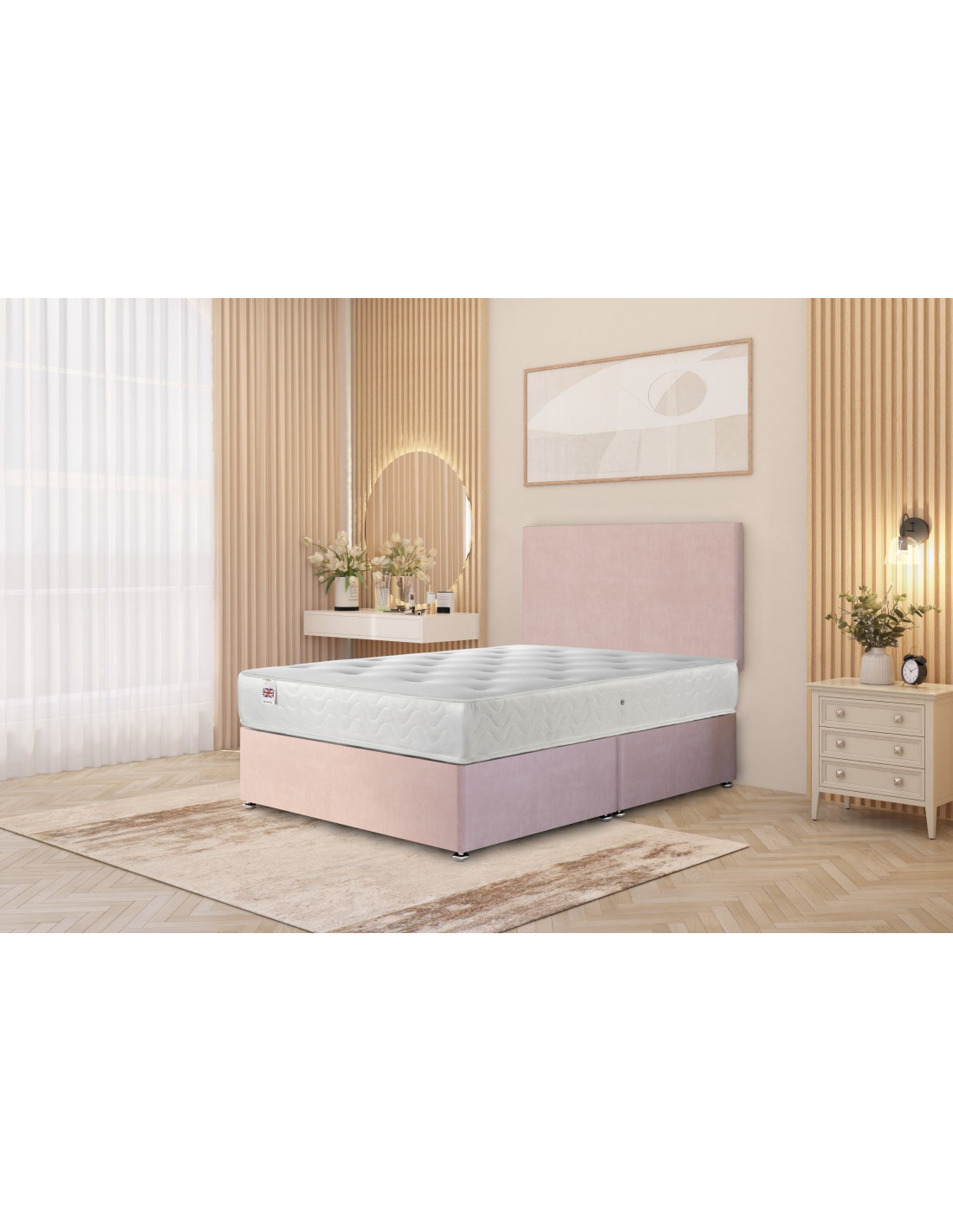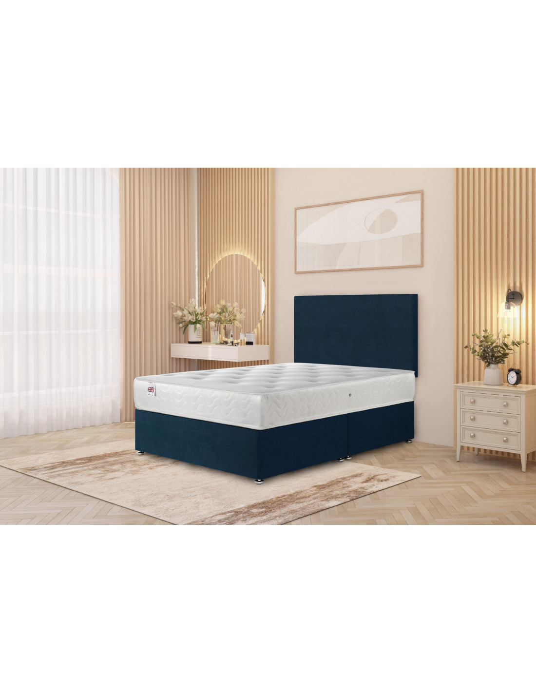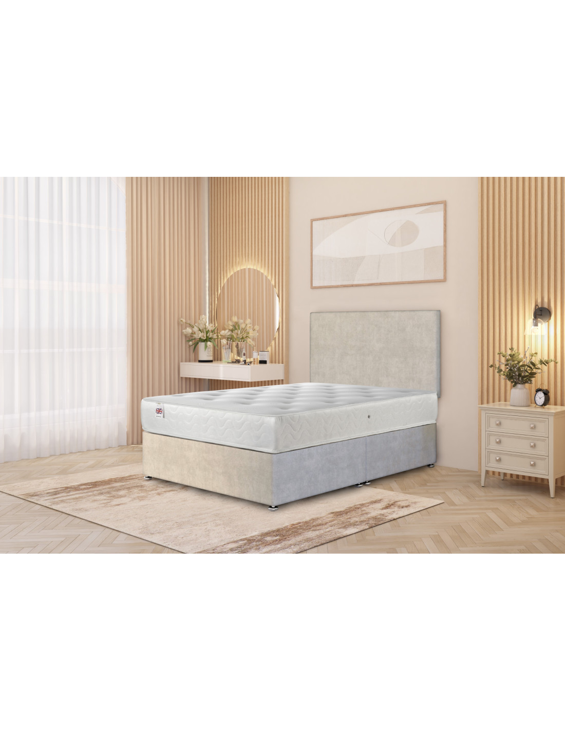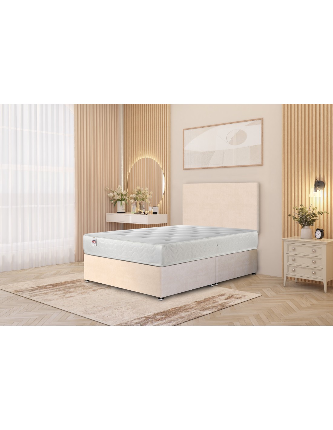 This divan set comes with a memory foam mattress and headboard. The base has no drawers. Upholstered 32" headboard can be adjusted in height using the struts. The solid platform top of the divan contributes to a better surface for your mattress to ensure the best nights sleep. The mattress will relieve pressure and take away your aches and pains. Chrome glides finish this bed and give a final elegant touch to the bed.