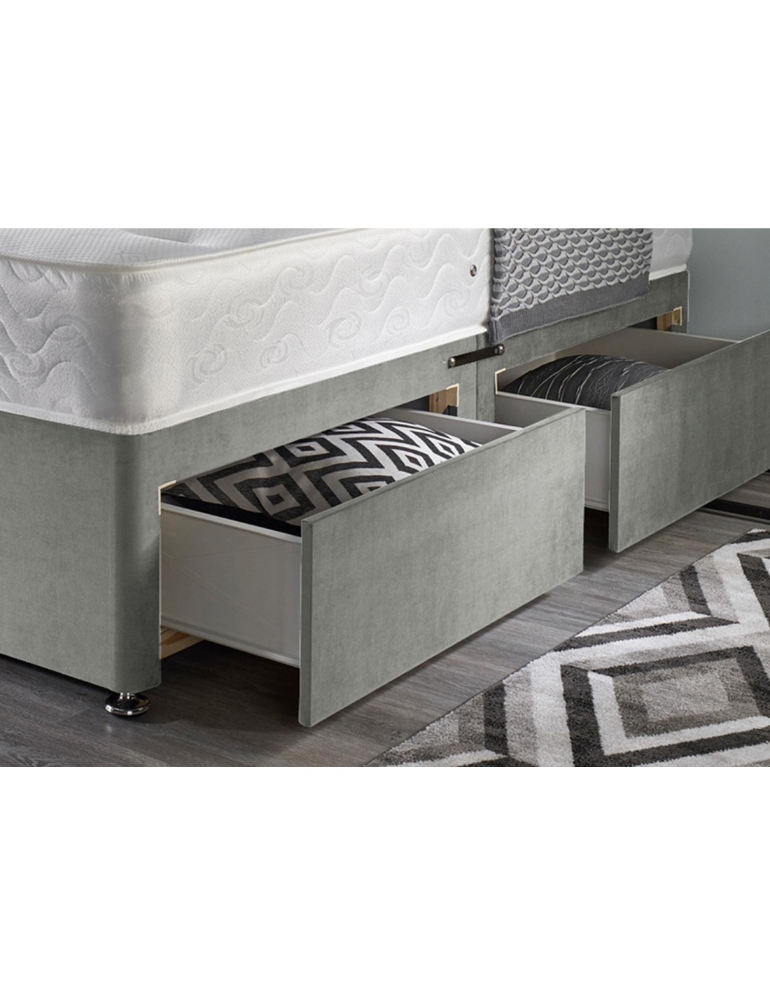 Our Ziggy Divan Base combines luxury upholstery with practicality and comfort. This classic bed base is available in both front-end or side opening drawer features, which is a great storage solution for seasonal furnishings, clothing, etc. The Ziggy Divan has the classic chesterfield style of upholstery, which is sure to never go out of style, fashioned with deep, patterned sections and finished with sleek button detail.